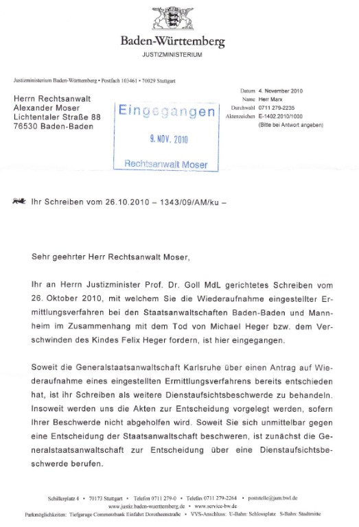 Antwort des Justizministeriums Baden-Württemberg vom 04.11.2010